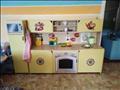 " Кухня"( бытовая техника, полотенца, прихватки, посуда,продукты). Таз для белья, прищепки и верёвка на которую дети вешают постиранное бельё. Набор "Хозяюшка" (ведро. швабра, совок, веник.). Диван, 2 кресла, обеденный стол для кукол.