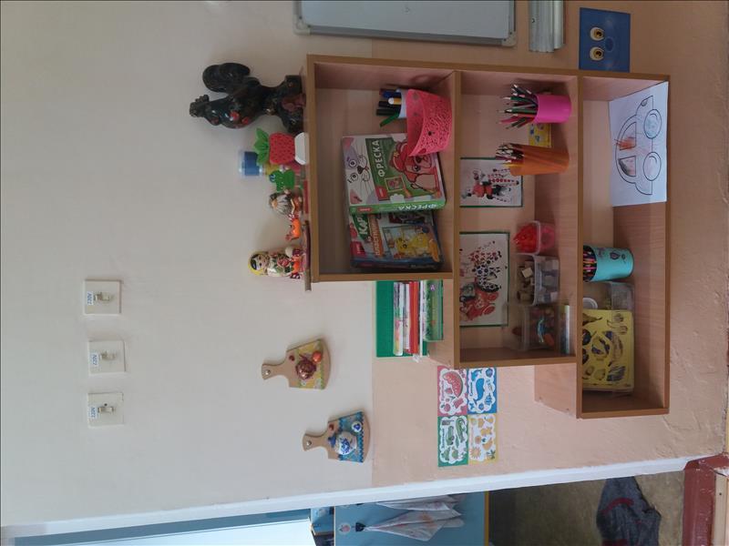 Доска для рисования магнитная.Доска двухсторонняя.Стаканы под карандаши основных цветов.Доска для лепки.Пластилин.Карандаши цветные,восковые.Краски пальчиковые .Гуашь.Набор кистей для рисования.Альбомы для рисования.Фломастеры.