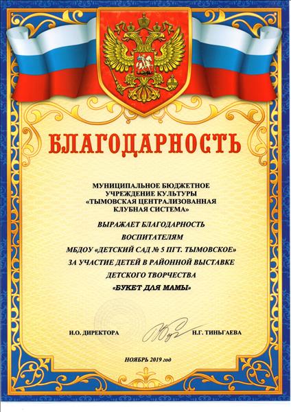Благодарность за участие детей в районной выставке детского творчества "Букет для мамы"