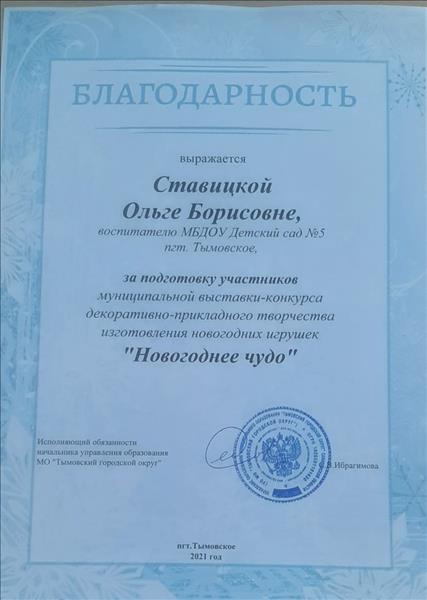 Благодарность за подготовку участников муниципальной выставки- конкурса декаративно прикладного творчества: " Новогоднее чудо"